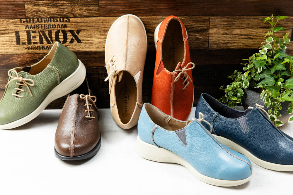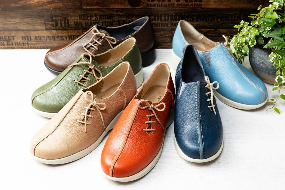 センターシームがスッキリ感を演出し サイドレースアップで甲高の方も微調整可能。内ゴムで脱ぎ履きが楽なスリップオンタイプ